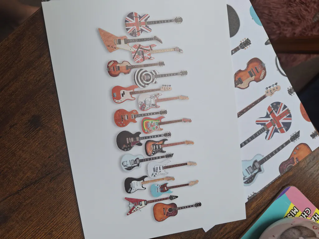 I ordered a sheet of guitar styled wrapping paper. I received a lovely email thanking me and advising re despatch. It arrived very quickly and I was delighted to find not only lovely quality wrapping paper but tags and various other things including a book mark and information about the guitars. Fab bundle to pass on to the birthday boy.